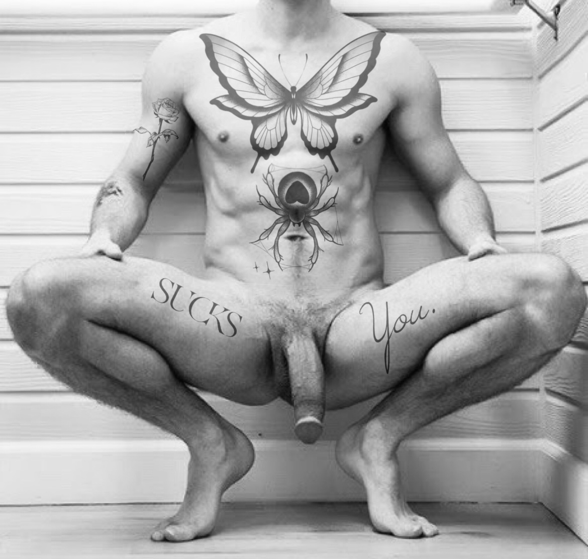 Andrew came through the door way, he was stark naked, holding a tray with four huge blue cocktails. They even were adorned with tiny umbrellas and fruit on the rim. Very camp! Andrew wasn’t though, he was definitely the butch one of them both. Dark long hair, in a man bun, neatly shaped beard. His torso and arms, covered in Tattoos. He was definitely a gym goer too. Nice big muscles, more of a rugby shaped body. He placed the tray on a small side table, and grabbed two glasses. He crouched down at the side of the pool, legs spread out. Two tattoos either side of his thighs saying “Sucks you” His big smooth balls and cock almost swinging and dangling down, showing off its massive cut cock, even though he was still soft.