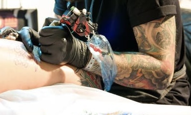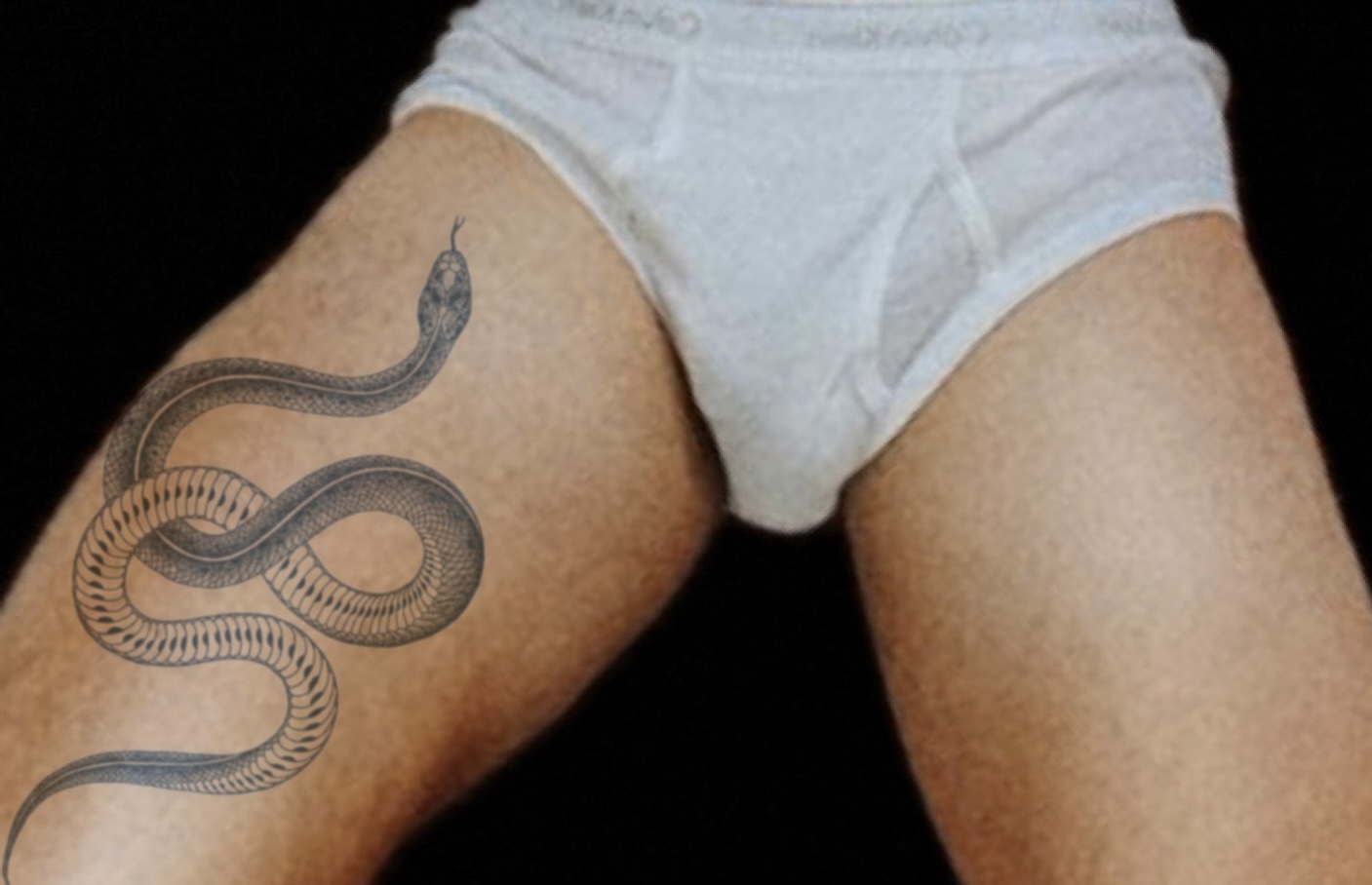 My first client of the day had arrived, Lee. I’m a tattoo artist and have my own shop. This was his first tattoo and was having a snake on his thigh. I printed it out and was ready to go. I went into reception and called him through to my room. He was a handsome chap, 6ft, dark blonde short cropped hair, clean shaven, athletic to muscular build with a great smile and set of legs. (He was wearing tight shorts.) Lee obviously worked out a lot. Being gay and single, I always appreciated a good looking guy. I showed him his design and both agreed it’s what he wanted. He admitted he was nervous about his first tattoo and I tried to reassure him, as I always did for anyone getting their first tattoo. I explained we would put the stencil on his leg first to place it and asked him to roll his shorts up some more. He tried but they were too tight, not a great idea when you’re coming for a tattoo, so he whipped them off. He was wearing white briefs underneath so much easier to expose his full thigh. I couldn’t help but notice his package, he was bulging his own snake down there. I could clearly see his imprint of his cock and he was definitely cut. I lined up his stencil and showed him in the mirror, he was happy with the placement of the tattoo. I got Lee to lay down on the couch and began with the outline of the tattoo.