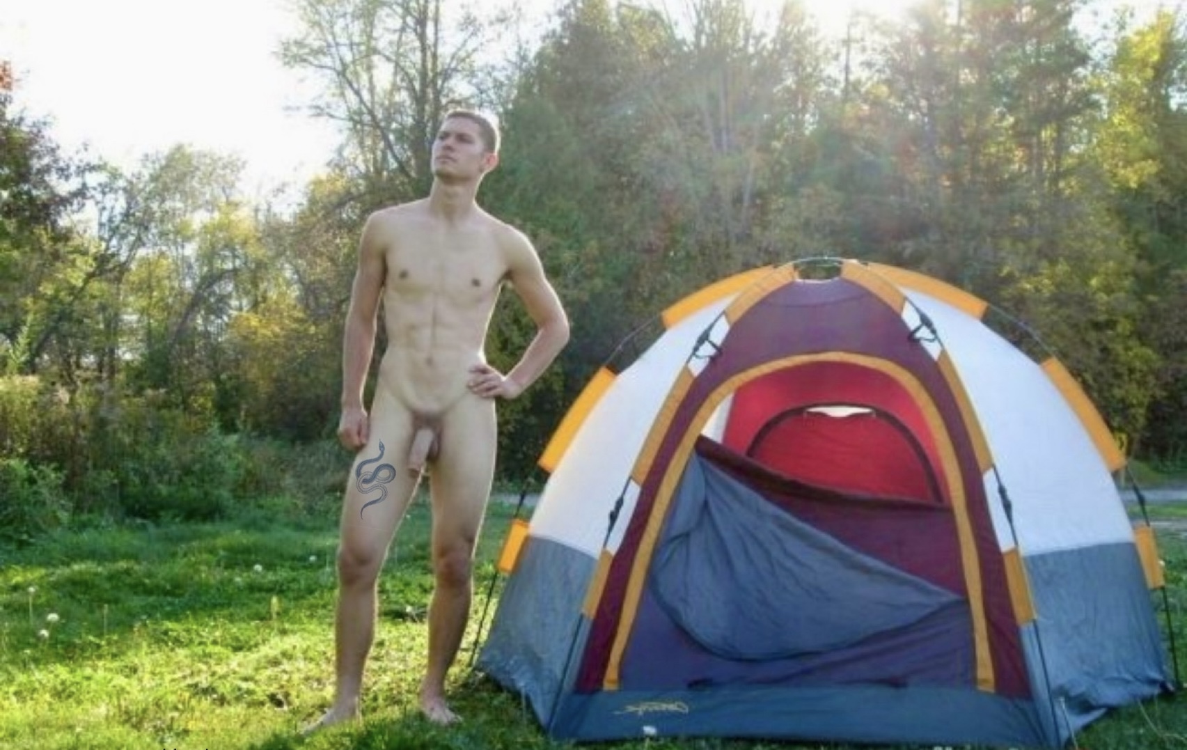 As Lee returned, walking back towards me with a handful of twigs and branches, his erection had gone. But his dick swung for side to side as he walked, it looked delicious. When he got back he dropped the wood and I passed him a can of beer. He smiled and laughed and said “This a nudist camp now then?” “Just drying off” I replied laughing. I really was confused as he was standing in front of me at this point stark bollock naked! He started the nudist camp after all! I was now eye to eye with his cock too. It was good however…getting a close up inspection. It was thick and meaty, I couldn’t stop staring straight at it, I could feel and see my dick awakening again. He obviously knew I was staring at it. Was he just an exhibitionist? Maybe I should put my shorts back on. He took a few swigs of his drink, turned around and put the can on the floor. He then spread his legs slightly as he bent right over to construct a camp fire. I was now directly facing his…spread apart ass and could clearly see his ass hole. It was lovely and pink, almost winking at me, it looked tight and I wanted to eat it. His big beautiful balls hung there like two apples in a tree, his penis hanging behind like a thick branch. I was sat in my chair slightly slouched and my dick was rock hard again! Was he doing this deliberately to tease me? As he continued to construct the fire he said “So are you enjoying yourself? Liking the scenery?” “Yes definitely! It’s quite beautiful around here” I said still staring directly at his bum hole. Did he mean his ass hole or the actual scenery? The sexual tension was growing. “Are you enjoying the scenery?” I said back. Still bent over fiddling with the wood, he turned his head to look back at me. Clocking the fact I had a raging hard cock, he replied “Oh definitely.” Smiling, He then turned back around to continue what he was doing. I just stared into his ass hole until he stood back up. As he turned around his dick was slightly excited but not like earlier. Lee came and sat beside me, swigging his beer, trying to ignore the fact I was erect. “It’s definitely to hot to wear clothing today. Besides it’s the way we were born and good for an overall tan. Come on there’s a nice little stream around here I want you to see.” Said Lee, slapping my thigh, his pinky finger grazing my cock as he did.