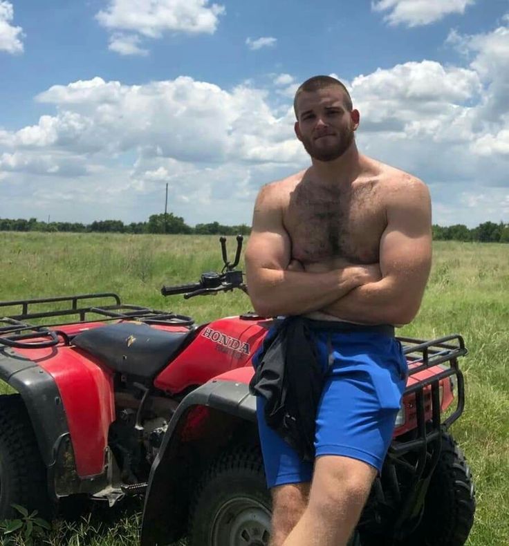 Josh picked up the blankets and shoved them in his bag. I decided to leave my shirt off as it was really warm. “Let’s head back sexy! I think they may have stopped and spoke to Lee to find out where I am.” Said Josh as we headed towards the noise of the engine that was heading towards us. He passed his phone to me and said “I would love your number for that tattoo we spoke about and maybe another fuck if you wanted one?” Said Josh. “Absolutely…. To both” I replied. I quickly punched in my number and passed him back the phone. Just as I did you could see and hear where the noises were coming from. There was a shirtless guy on a quad bike and a guy on a dirt bike driving towards us. “It’s the farm hands” said Josh. “Ok….do any of you wear clothes around here?” I said laughing. “Not when it’s hot No!” He replied. When they got to us they turned off the engines. Wow the guy on the quad, was a hunk! Shirtless, Shaved head, beard, hairy muscular chest and arms bigger than cannons. Yum! He jumped off his quad and said to Josh in a deep manly voice “Sorry boss! The tractor has broken down again, so we need you! I stopped and asked Lee were you where” I didn’t even look at the other guy “No worries Dan!….. this is Lee’s mate Zac…” he looked at the other guy on the dirt bike and said “You can take me back to the farm Andy and Dan (turned looking at him) Can you make sure Zac gets back to Lee safely please” said Josh. What a gentleman! Josh walk over to me and said facing away from the other two farm hands, “That was a lot of fun! I will be in touch about that tattoo!” he winked at me, shook my hand and walked over to Dan who was leaning his bum on the quad bike. Josh whispered something in Dans ear and tapped him on the shoulder before getting on the back of the dirt bike with the other guy Andy. He started it up and off they went. I gave a casual wave to Josh as he left. “Nice to meet you!” Said Dan holding out his hand to shake it. I walked over and shook his big hand. He had a strong grip and rough skin. “Nice to meet you Dan!” I replied. “So you wanna head straight back to Lee or go for a ride on this?” He said tapping the quad. “Im easy going to be honest! Where you going to take me?” I asked casually, in my head I was thinking, fuck yes I do want a ride, but on you not your quad! Just then I was imagining him fucking me over the quad bike in my head.
